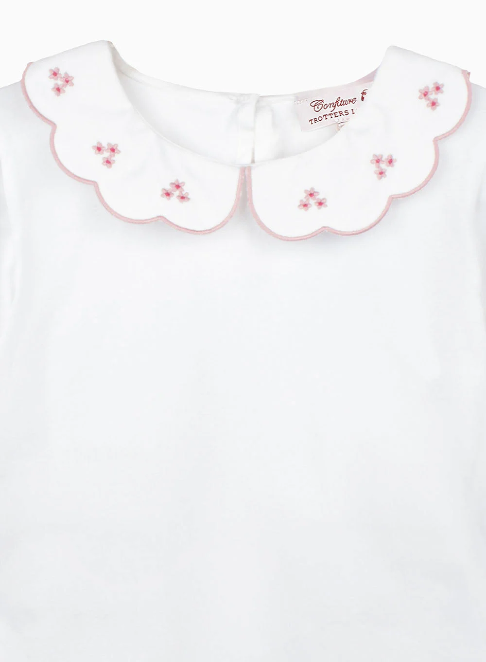 Our classic jersey blouse has been given a pretty twist this season with the addition of a pretty pink embroidery along the collar with scalloped edges. This simple and elegant jersey top for girls features a full length button fastening down the back and elasticated cuffs. It's perfect for layering under your favorite knitwear for a smart finish.