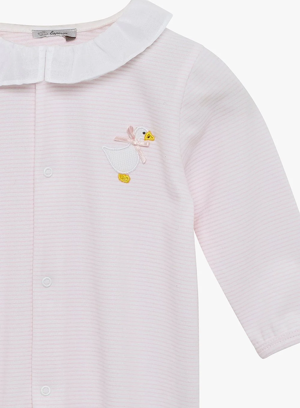 This much-loved Trotters classic has had an update. Now made from organic cotton jersey, this pretty pink onesie for baby girls features our signature appliqué duck adorning the front chest, a pretty petal collar and handy popper fastenings down the front to allow for easy dressing and changing.