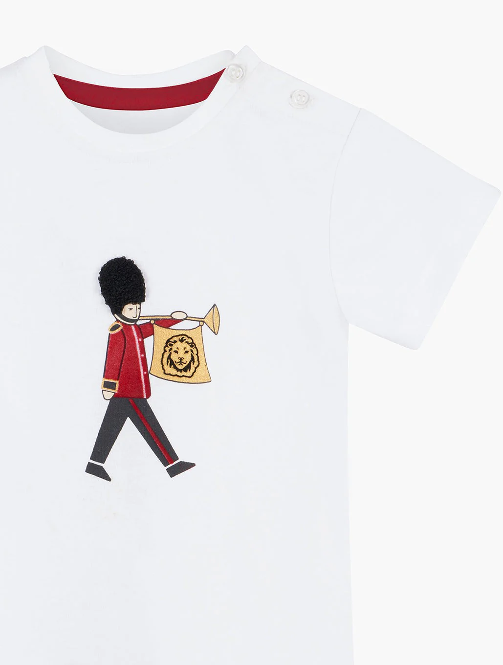 This soft, short-sleeved t-shirt for baby boys comes in a classic white 100% cotton and features our signature guardsman motif on the front. Pair with some shorts for a great everyday outfit.