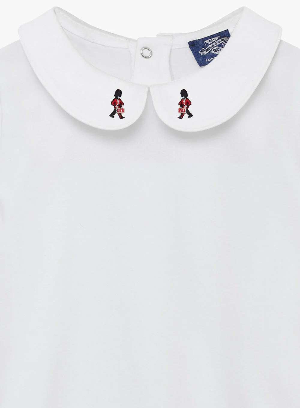This soft jersey bodysuit features smart guardsman embroidered on its Peter Pan collar and is perfect for layering under dungarees & bib shorts for a great everyday outfit for baby boys. It fastens with poppers at the center back and along the leg seams for easy dressing.