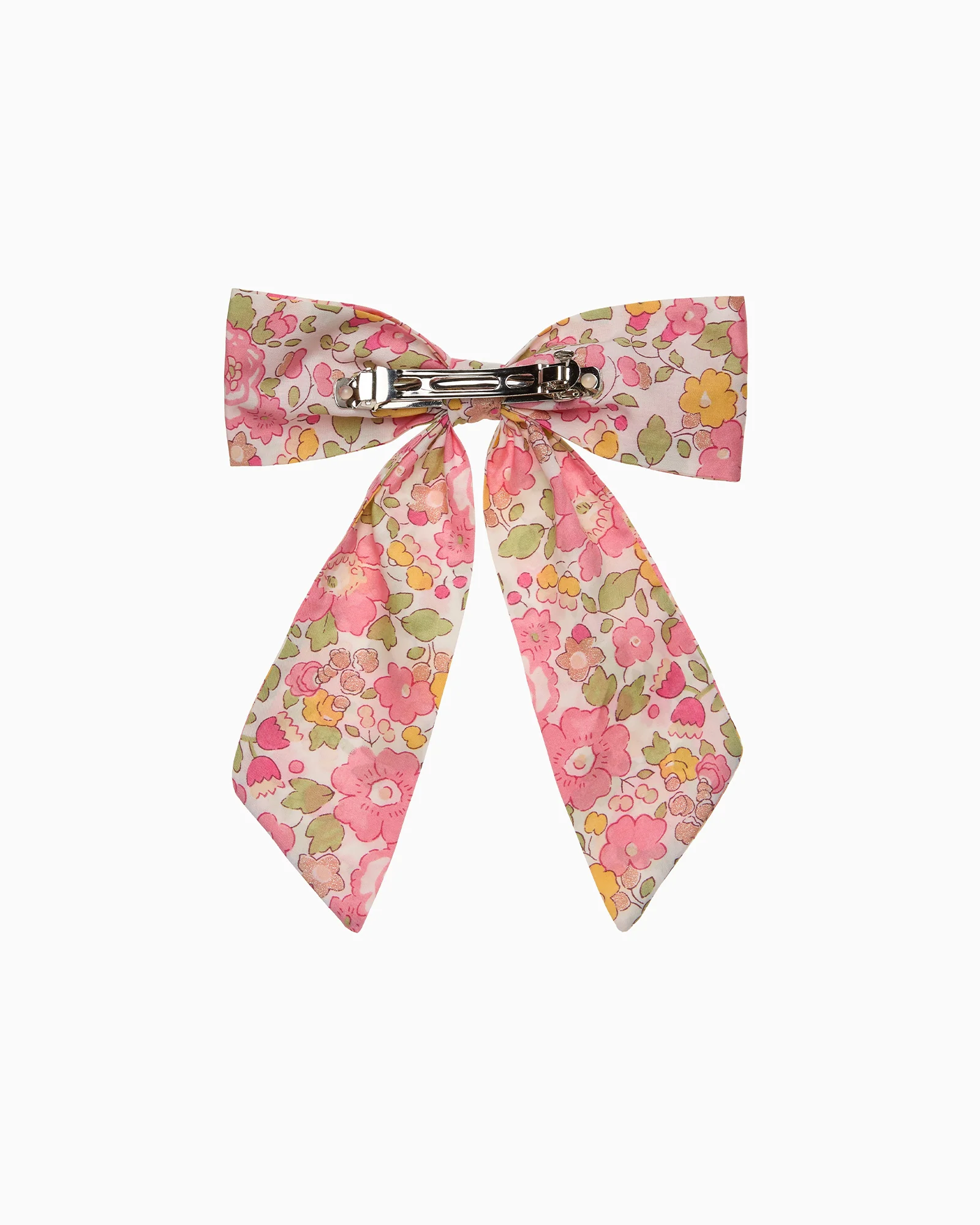 This pretty bow hair clip is made in Liberty's Betsy print fabric, an iconic stylized floral design that dates from the 30s, complete with subtle sparkle detailing. The perfect accessory to elevate your spring/summer wardrobe, it comes complete with a grosgrain backing and barrette clip that will securely hold all hair types.