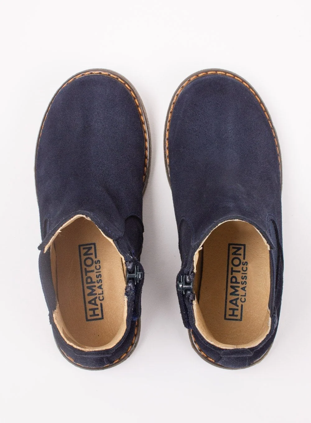 Our Burlington Chelsea style boots in smart navy suede with a crepe effect rubber sole. They have a breathable leather lining and a side zip. They are both elegant and practical.